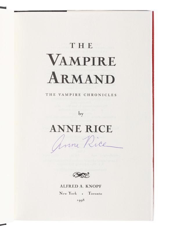 7) The Vampire Armand. New York: Alfred A. Knopf, 1998. FIRST EDITION. SIGNED BY RICE.