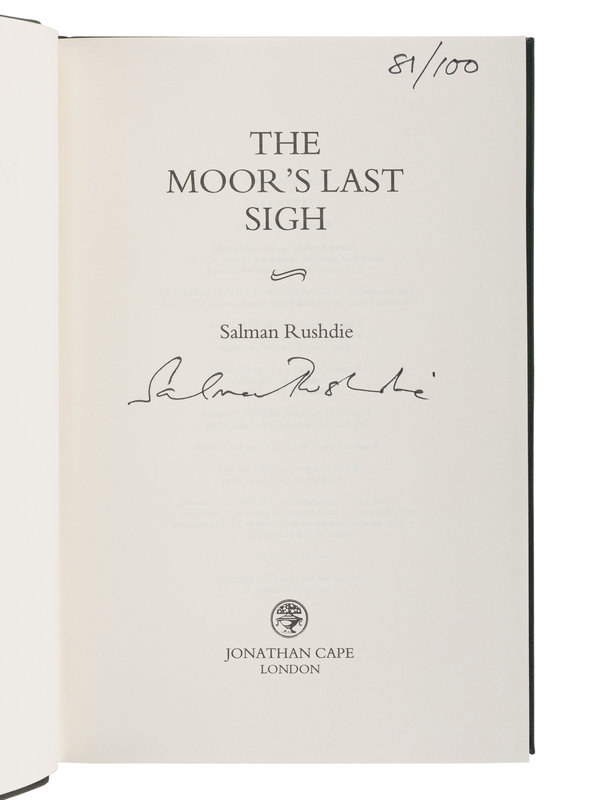 FIRST EDITION, LIMITED ISSUE, number 81 of 100 copies SIGNED BY RUSHDIE on the title-page and in a deluxe morocco binding. The Moor’s Last Sigh takes its name from the story of Boabdil, the last Moorish king of Granada, and draws on historical figures and events, tracing four generations of the narrator’s family. It won the Whitbread Prize for best novel in 1995, and was shortlisted for the Booker Prize in the same year.