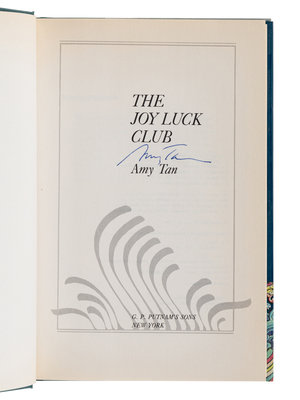 FIRST EDITION, FIRST ISSUE OF TAN’S FIRST NOVEL, in FIRST ISSUE DUST JACKET with the “$18.95” price and the “$26.50” Canadian price beneath, and the back flap lists publisher’s address as “200 Madison Avenue.” SIGNED BY TAN on the title-page. The Joy Luck Club revolves around 4 Chinese migrant families in San Francisco who start a mahjong club and was adapted to film in 1993.
