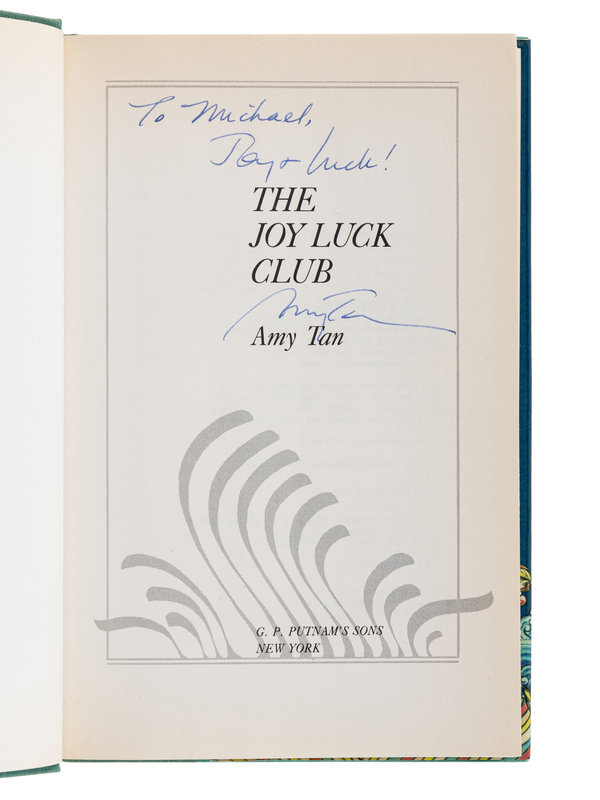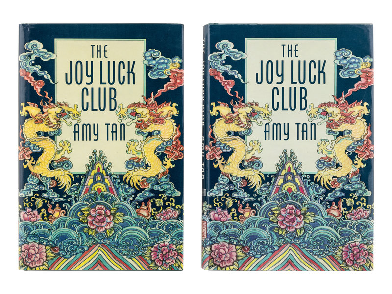 [With:] TAN, Amy (b. 1952). The Joy Luck Club. New York: G.P. Putnam’s Sons, 1989. 8vo. (Slight toning.) Original cloth-backed boards (slight fading); publisher’s printed dust jacket. FIRST EDITION, later printing, in a later issue dust jacket with the publisher’s address missing on the back flap, but present on the front flap. PRESENTATION COPY, INSCRIBED BY TAN: “For Michael, Joy & Luck! Amy Tan.”