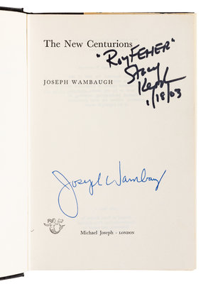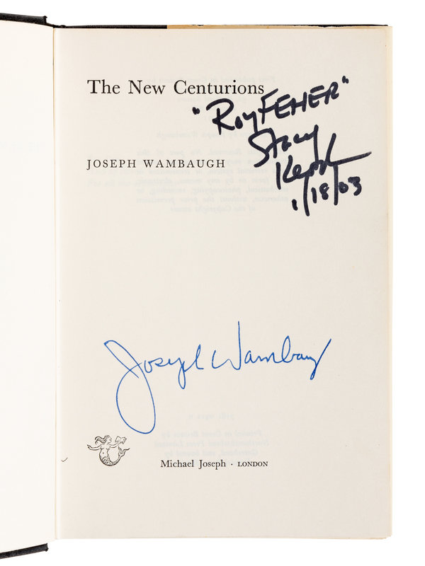 FIRST BRITISH EDITION. SIGNED BY WAMBAUGH AND INSCRIBED BY STACY KEACH, who played Roy Fehler in the 1972 film adaptation. The New Centurions was written while Wambaugh was working as a sergeant in the Los Angeles Police Department.