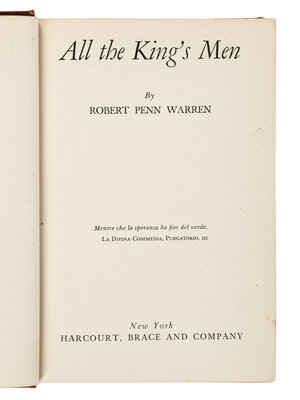 FIRST EDITION, IN THE FIRST ISSUE DUST JACKET with the blurb from Sinclair Lewis on the rear panel. Warren received the 1947 Pulitzer Prize for All the King's Men and was later awarded the Pulitzer Prize for Poetry in 1958 and 1979. He remains the only author to have won Pulitzer Prizes for both fiction and poetry.
