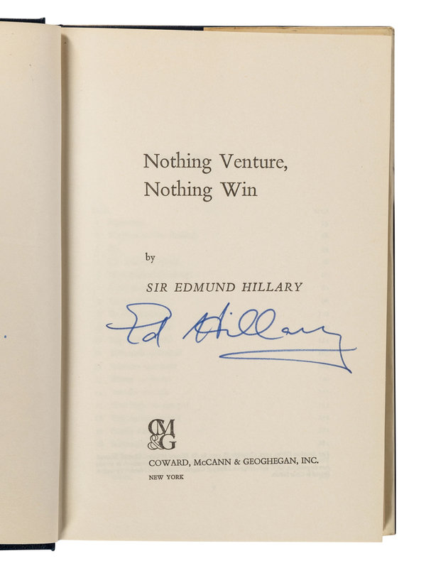 8) HILLARY, Edmund, Sir. Nothing Venture, Nothing Win. New York: Coward, McCann, & Geoghegan, Inc., 1975. Original cloth; publisher's dust jacket. FIRST EDITION, SIGNED BY HILLARY.