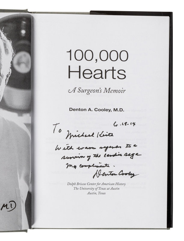 5) COOLEY, Denton A. 100,000 Hearts: A Surgeon's Memoir. Austin: The University of Texas at Austin, 2012. Original cloth; publisher's dust jacket. FIRST EDITION, INSCRIBED BY COOLEY.