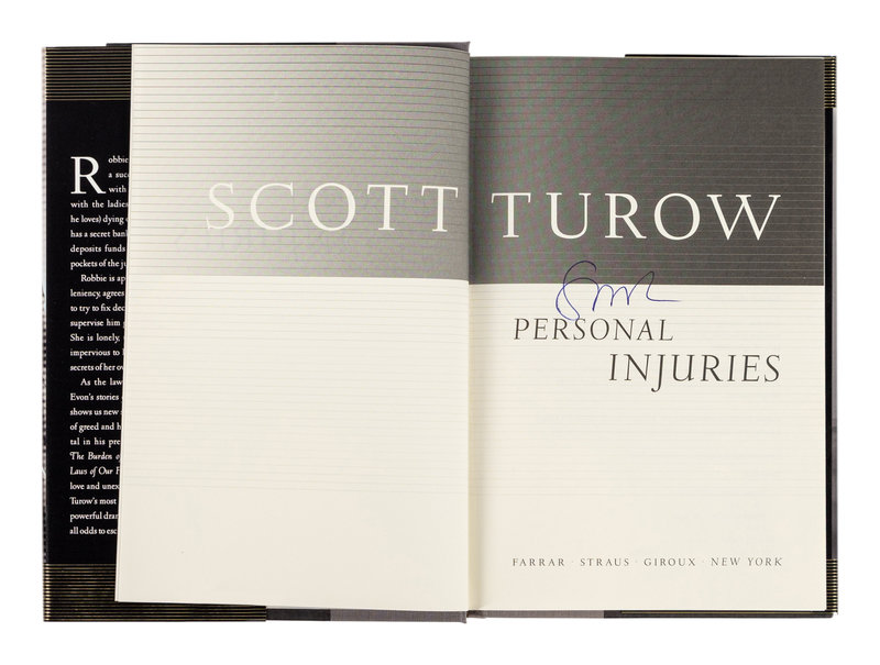 8) TUROW, Scott. Personal Injuries. New York: Farrar, Straus, & Giroux, 1999. 8vo. Publisher's cloth; original dust jacket. FIRST EDITION, SIGNED BY TUROW on title page.