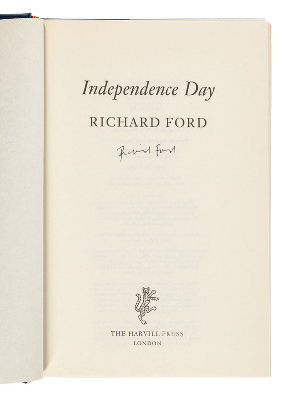 1) FORD, Richard. Independence Day. London: The Harvill Press, 1995. 8vo. Publisher's cloth; original dust jacket. FIRST BRITISH EDITION, SIGNED BY FORD on title page.