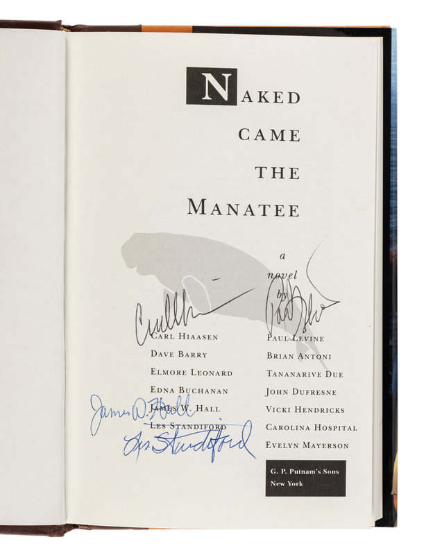 3) HIASSEN, Carl, et al. Naked Came the Manatee. New York: G.P. Putnam's Sons, 1996. 8vo. Publisher's cloth; original dust jacket. FIRST EDITION, SIGNED BY HIASSEN, JAMES W. HALL, LEE STANDIFORD, AND PAUL LEVINE on title page.