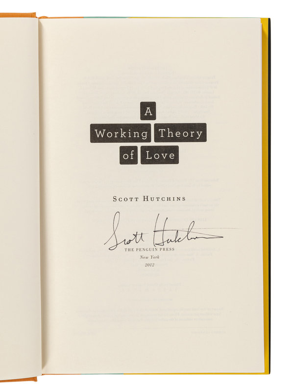 2) HUTCHINS, Scott. A Working Theory of Love. New York: The Penguin Press, 2012. 8vo. Publisher's cloth; original dust jacket. FIRST EDITION, SIGNED BY HUTCHINS on title page.
