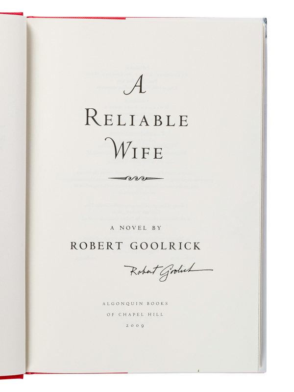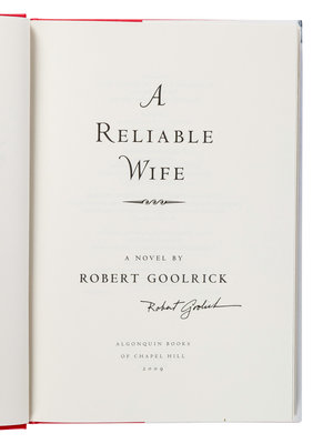 2) GOOLRICK, Robert. A Reliable Wife. Chapel Hill, NC: Algonquin Books, 2009. 8vo. Publisher's cloth; original dust jacket; original slipcase. FIRST EDITION, SIGNED BY GOOLRICK on title page.