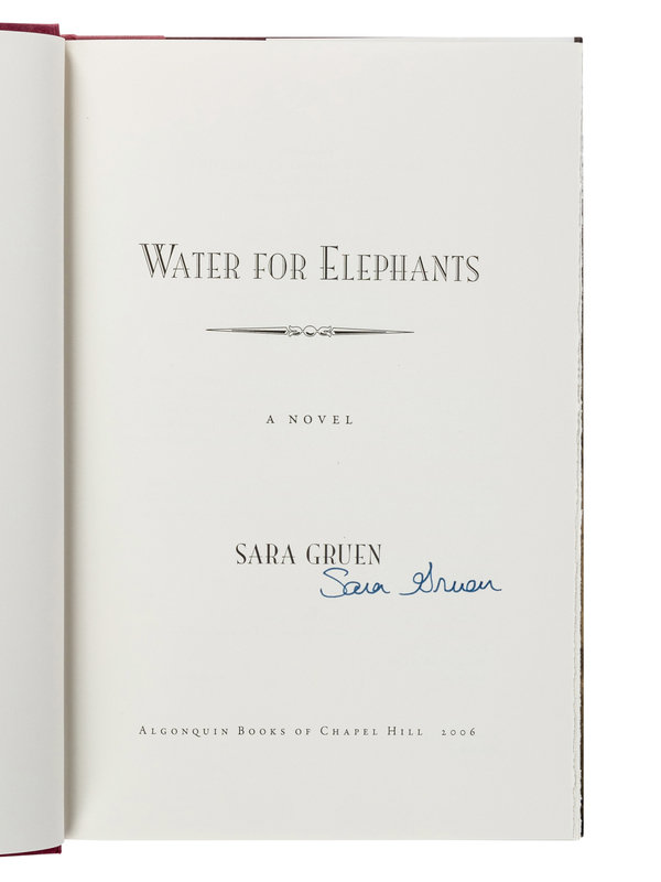 3) GRUEN, Sara (b. 1969). Water for Elephants. Chapel Hill, NC: Algonquin Books, 2006. 8vo. Publisher's cloth; original dust jacket. FIRST EDITION, SIGNED BY GRUEN on title page.