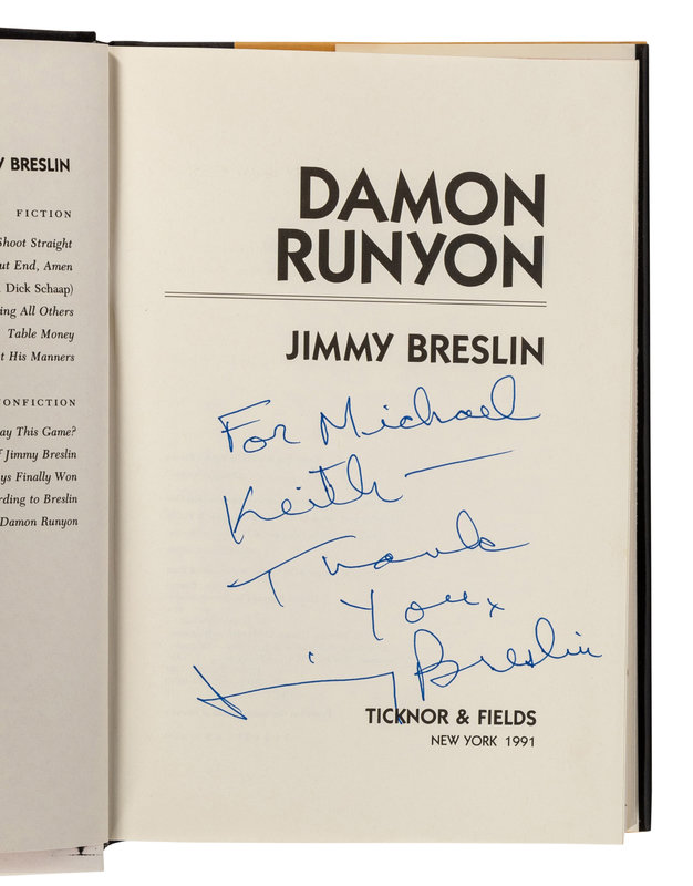 2) BRESLIN, Jimmy. Damon Runyon: A Life. New York: Ticknor & Fields, 1991. 8vo. FIRST EDITION. PRESENTATION COPY, INSCRIBED BY BRESLIN.