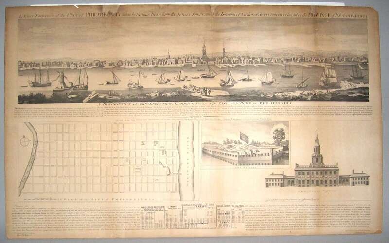 Lithograph. Rosenthal, L.N. after Scull, Nicholas & Heap, George. "An East Prospect of The City of Philadelphia... The Province of Pennsylvania." Philadelphia: E.H. Coggins, 1854. 38 x 23 1/4 inches; 965 x 590 mm - sheet size. Mounted to bd., moderate toning, occasional darkening & discoloration, some chipping & minor paper loss along top edge.