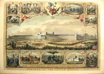 Hand-Colored Lithograph. Schile, H. "1776, Centennial International Exhibition, 1876. History of The United States. Main Exhibition Building, Fairmount Park,..." New York, 1875. 19 1/4 x 26 1/4 inches; 489 x 667 mm - image size. Generally clean & bright.