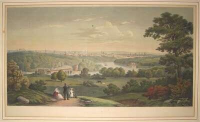 Hand-Colored Engraving. Serz, J. after Weber, Paul. "Philadelphia. View from Peters Farm." Philadelphia: Wm. Smith, n.d. [ca. 1855]. 12 1/2 x 22 3/4 inches; 317 x 578 mm - image size. A few small ink stains in image, title slightly faded, mounted to bd. Image generally clean & bright.