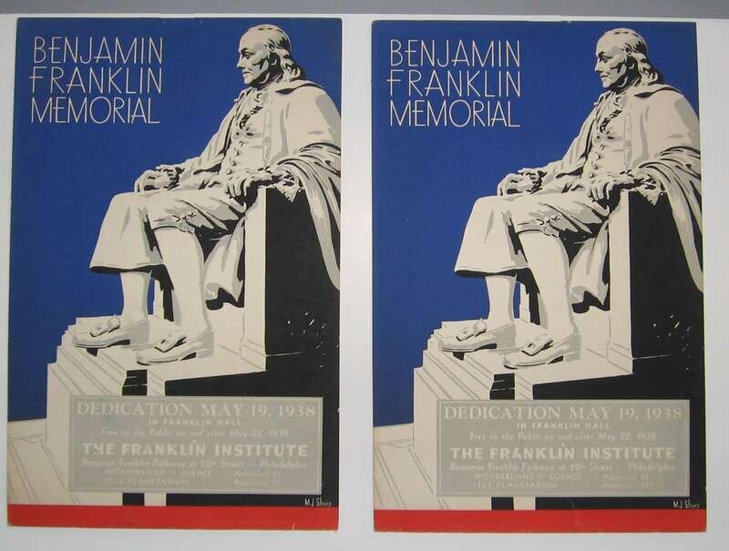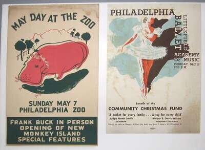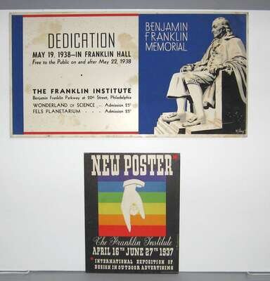 Posters - Philadelphia Museums & C: Brodovitch, A. "New Poster. The Franklin Institute." 1937. Color litho, 11 z 8 1/2 inches; 279 x 216 mm. Condition B/B-: some edge wear, dust soiled, mtd. to period bd. A pointing finger against a color spectrum. * "Philadelphia Littlefield Ballet." Ca. 1930-1940. Color litho & screen, 20 x 14 inches; 508 x 355 mm. Condition B/B-: spotting & soiling overall. A ballerina pirouettes. * Sharp, M.J. "Benjamin Franklin Memorial. Dedication May 19, 1938." Color litho, 21 3/4 x 13 3/4 inches; 552 x 349 mm. Condition B: some light wear to edges & corners, small chip at top center edge, some very minor soiling, mtd. to period bd. with fold. stand. Overall clean & bright. Image of the new statue of Benjamin Franklin at The Franklin Institute. * Another copy of the preceding, condition B: some wear to edges & corners, some dust soiling, mtd. to period bd. with fold. stand. * Another copy of the above in horizontal format, 11 x 21 inches; 279 x 533. Condition B-/C+: wear & creasing to lower right corner, spotting & soiling overall. * "May Day at The Zoo." Ca. 1930-1940. Color screen, 22 x 14 inches; 559 x 355 mm. Condition C: much wear, chipping & soiling along top edge, other scattered soiling & wear, mtd. to period bd. A content pink hippo.