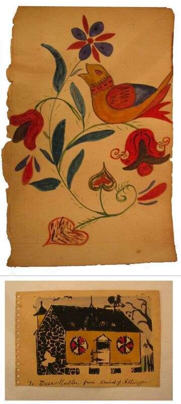 Including a block print of a barn, inscribed "To Bess Muller from David Y. Ellinger," together with a watercolor on paper , unframed.