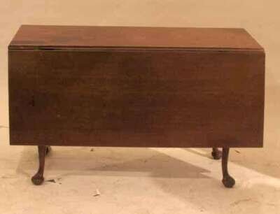 Rectangular top with deep conforming leaves, arched skirt on cabriole legs ending in pad feet.