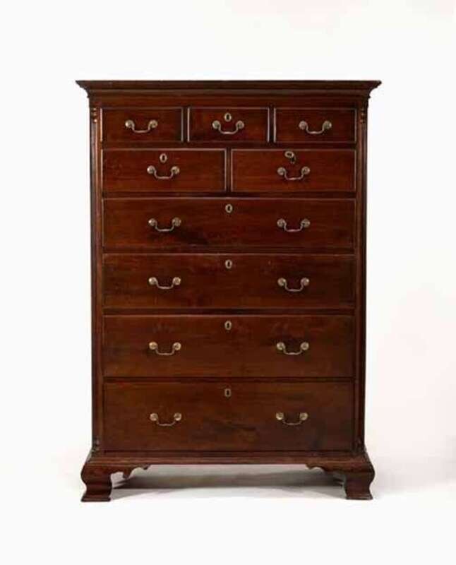 Molded cornice above arrangement of nine thumb-molded drawers flanked by fluted quarter columns, ogee bracket feet.