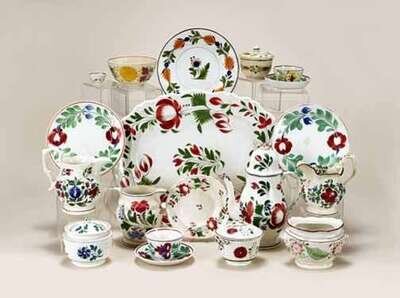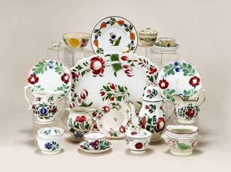 Including a platter, coffee pot, three plates in "Red Rose" pattern , three pitchers and a teabowl and saucer in blue, red and green flower pattern, two covered sugar bowls decorated with floral sprigs, five pearlware items, plate, covered sugar, teabowl and saucer and miniature teabowl in green, yellow and bittersweet and brown floral ring pattern, and a waste bowl in yellow and pink flower.