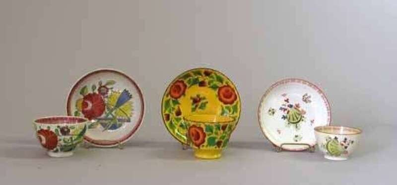 The first in canary yellow decorated with red and green rose pattern, the second in variation of Gaudy Dutch "Oyster" pattern, and the third in a shell and flower design.