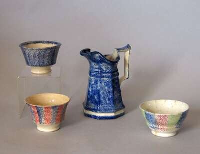 Including a rainbow teabowl in green, red, and blue; a rainbow teabowl in red and blue; a blue teabowl and milk jug.