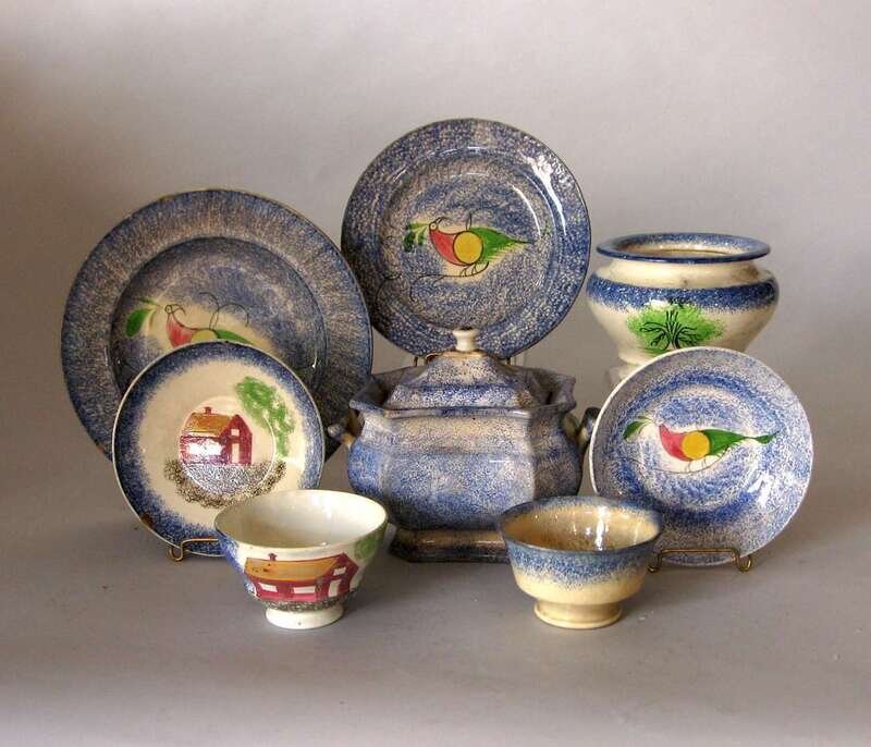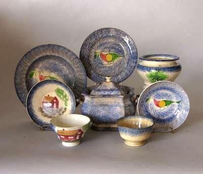 Including a "Tree" pattern sugar bowl, a blue covered sugar, a blue "House" pattern teabowl and saucer, and a blue spatterware teabowl, blue "peafowl" pattern saucer and two plates.