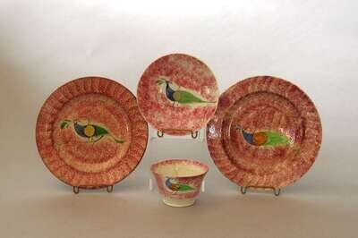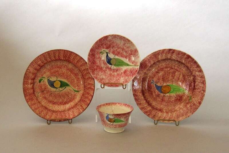 Four Staffordshire red Spatterware "Peafowl" items circa 1830