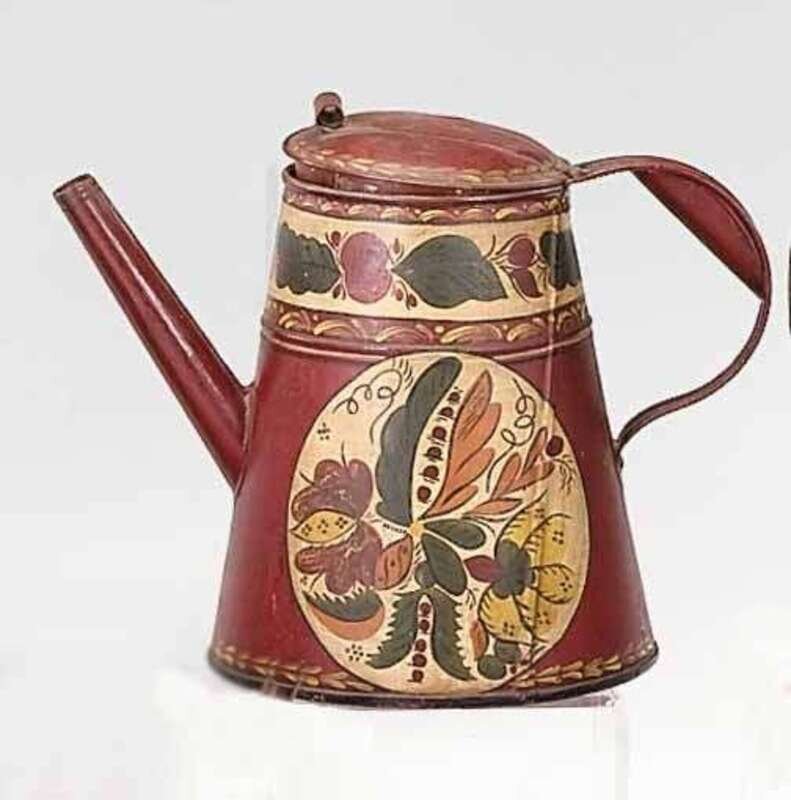 Slightly domed top and tapering sides painted red and decorated with white banding and circular reserves with leaf and berry vine and floral spray, yellow leafy borders.