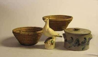 Including two coiled rye baskets, a chalkware dove and a cobalt-decorated stoneware butter crock.