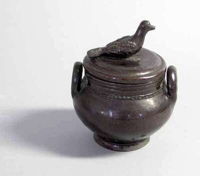 With bird-form knop on circular lid and urn-form bowl.