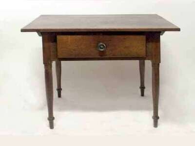 Rectangular top above single drawer and tapering turned legs ending in peg feet.