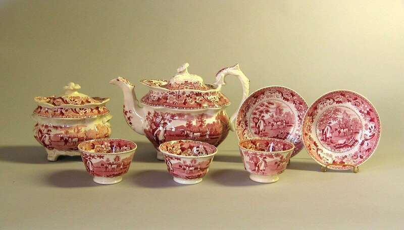 Eight Staffordshire red transfer-decorated tablewares circa 1840