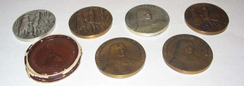 The first from the Centennial , with a figure of Liberty and the inscription" These United Colonies are, and of right ought to be, free and Independant States 1776" the reverse, "By the authority of the Congress of the United States In commemoration of the Hundreth Anniversary of American Independence1876," in a paper box, the six others, two sterling and four copper, commemorating the 150th anniversary of the " 1682 Arrival of William Penn in America 1932," with portrait bust of Penn on one side, the reverse with Penn meeting with the Indians.
