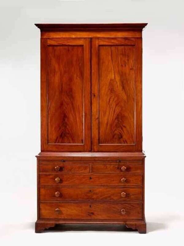 In two parts, the upper section with molded cornice above two recessed panel doors opening to drawers, pigeon holes, on base with four cock-beaded drawer with turned pulls, bracket base.