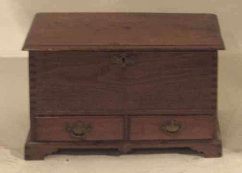 The molded rectangular lid opening to well with till, above conforming case with two lip molded drawers on a molded bracket base.