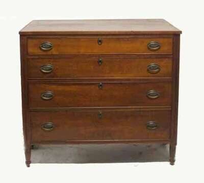 Rectangular top with molded applied edge above four cockbeaded drawers and reeded stiles, paneled sides, turned feet.