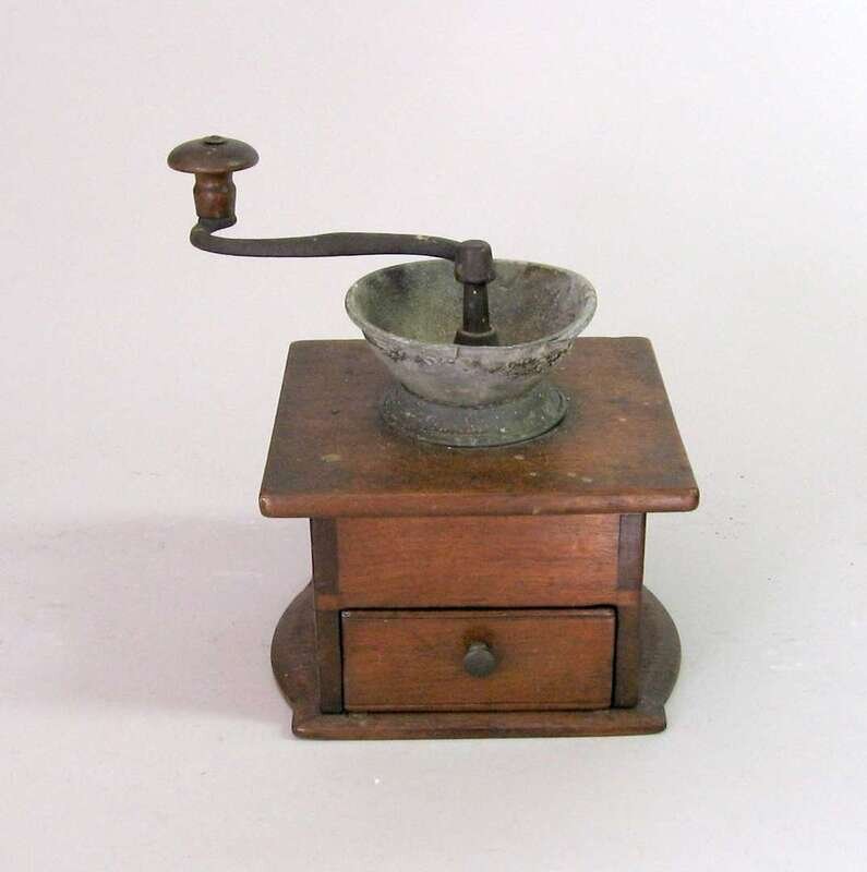 With wood-turned handle on "s" form arm above rectangular top and case fitted with a drawer, shaped molded base.