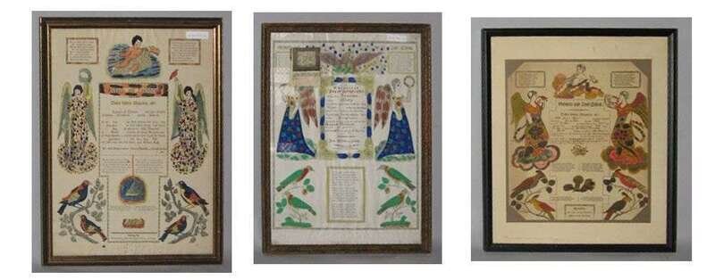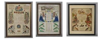 The first two printed by Johann Ritter, 1828 and 1848, the third printed by Blumer and Leisenring, dated 1853, all with angels birds, the first two with cherubs, the last with the American Eagle framed.