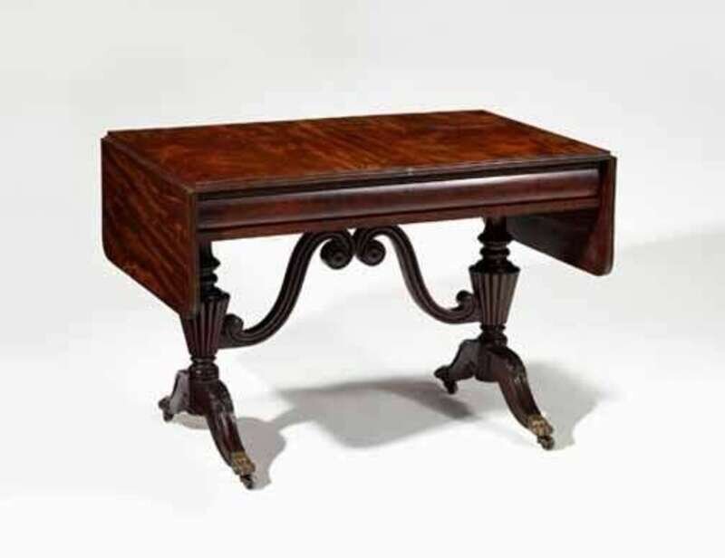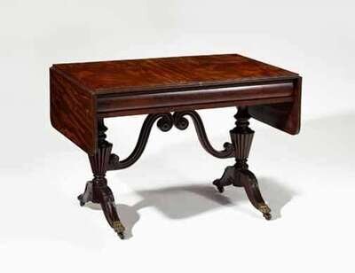 The rectangular top and conforming, round-cornered leaves with molded edge on a molded apron, raised on ring turned and tapering reeded urn form supports joined by scrolled stretcher, arched leaf-carved and molded legs ending in brass caps.