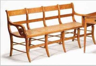 Tablet back above scrolled arms enclosing cane seat on ten saber form legs .