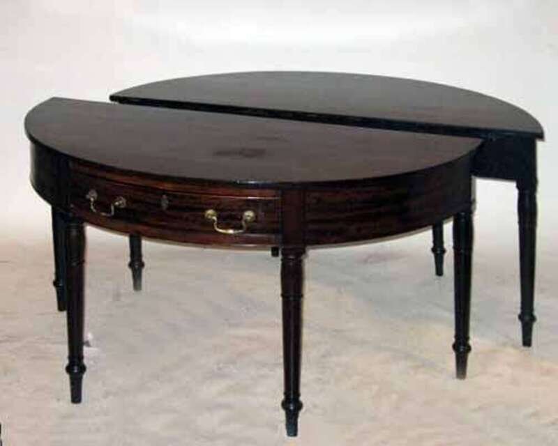 The end segments of demilune form fitted with a drawer on tapering legs ending in peg feet, the center section rectangular with deep leaves.