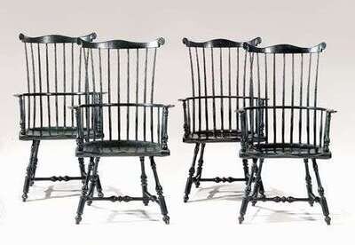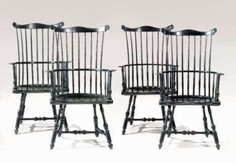 Set of four black finished Philadelphia style comb back armchairs 20th century