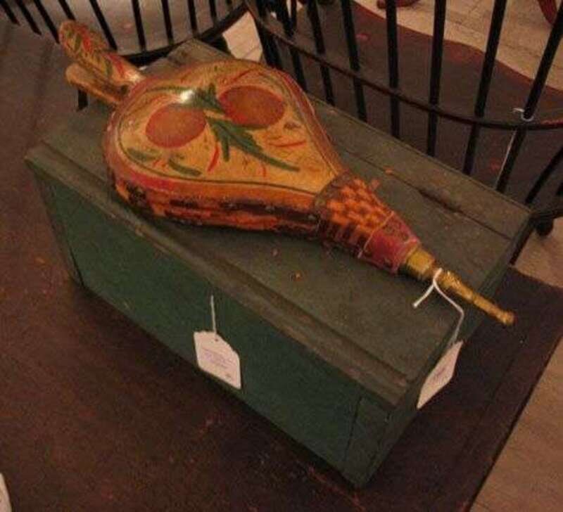 Painted and decorated fireplace bellows and a painted box 19th century