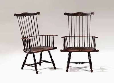 Pair of Philadelphia style carved and painted comb back Windsor armchairs david t. smith, morrow, ohio, 20th century