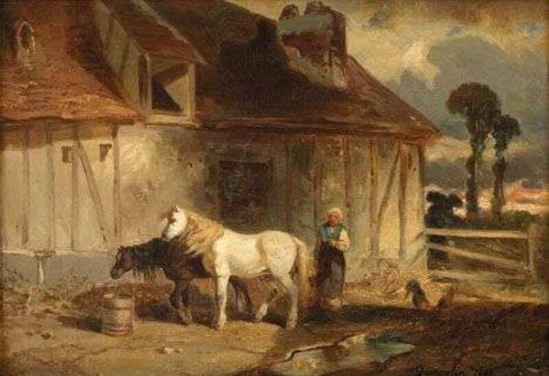 * DUMOULIN (FRENCH 19TH CENTURY) HORSES WATERING IN A FARMYARD