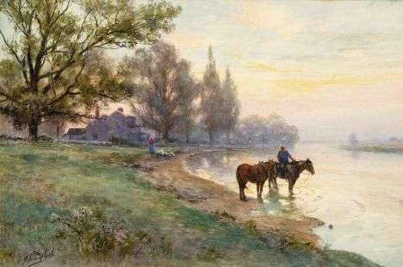 FRANK F. ENGLISH (AMERICAN 1854-1922) WATERING THE HORSES