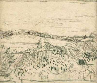 Signed "Varley" bottom right, inscribed in pencil "Composition for Painting - Sumach Ploughed Fields - Waterloo County" verso, charcoal on paper laid on card