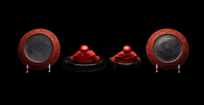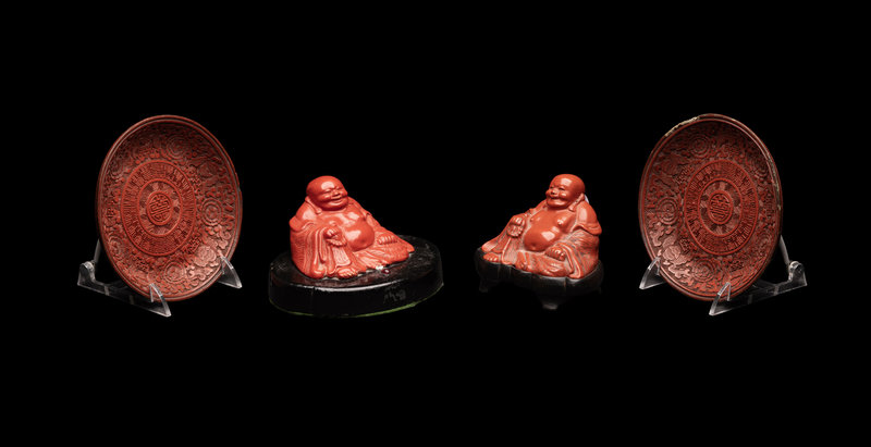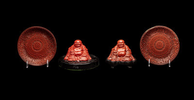 comprising a pair of laughing Buddha figures, and a pair of circular dishes carved with shou medallions and blossoming flower heads.