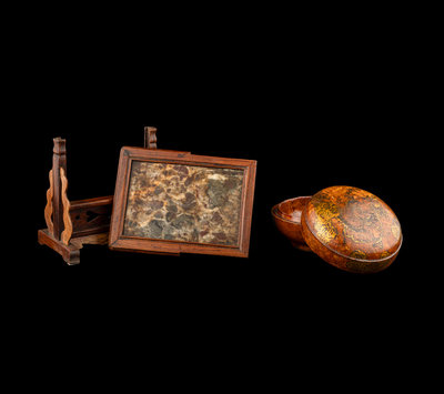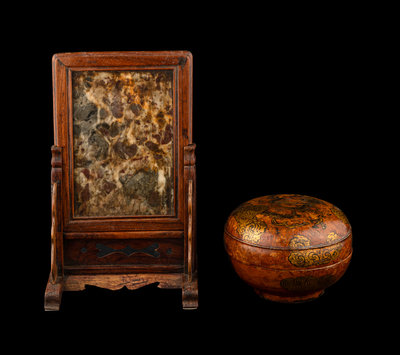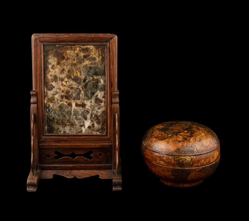 A Chinese Dream Stone Inset Huali Wood Table Screen and A Gilt Lacquered Wood Covered Box