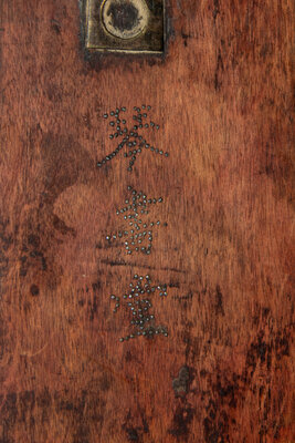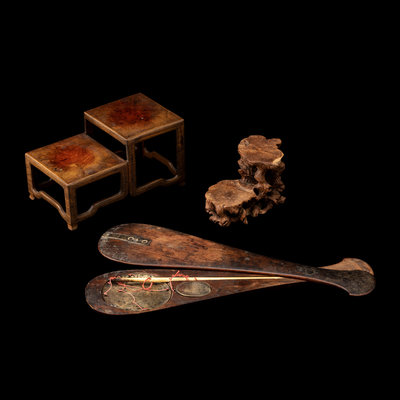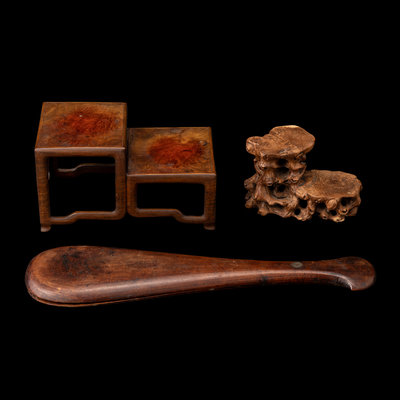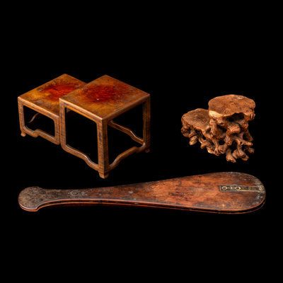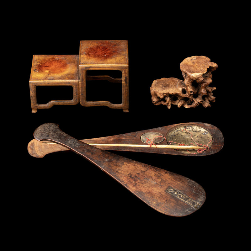 comprising two tiered table stands and a pocket scale marked qin shu tang with raised bosses.